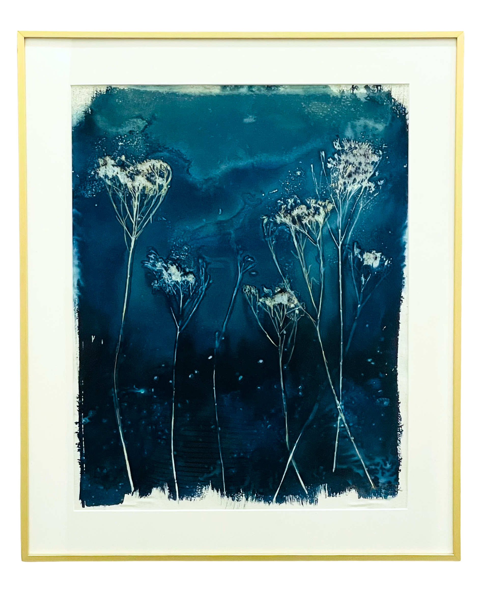 A stunning original cyanotype of Colorado Golden Brush embellished with gold ink lines. Texturized with unique additives to pull out a distinctive exposure of the leaves.