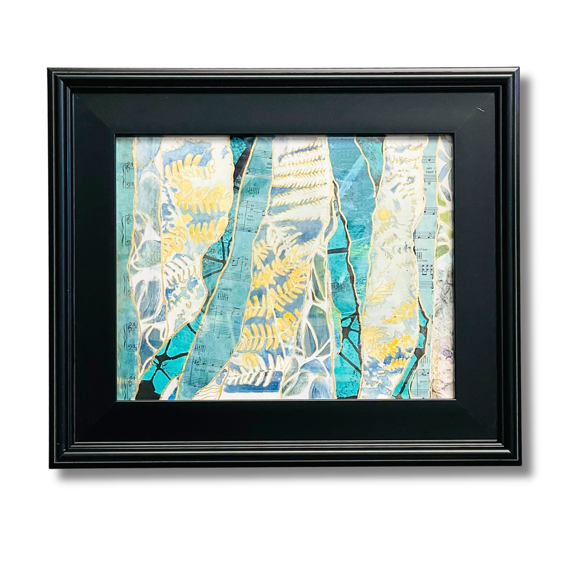 14x11" ( professionally framed to 19x16" black frame) original mixed media cyanotype embellished with gold watercolor and gold pen.