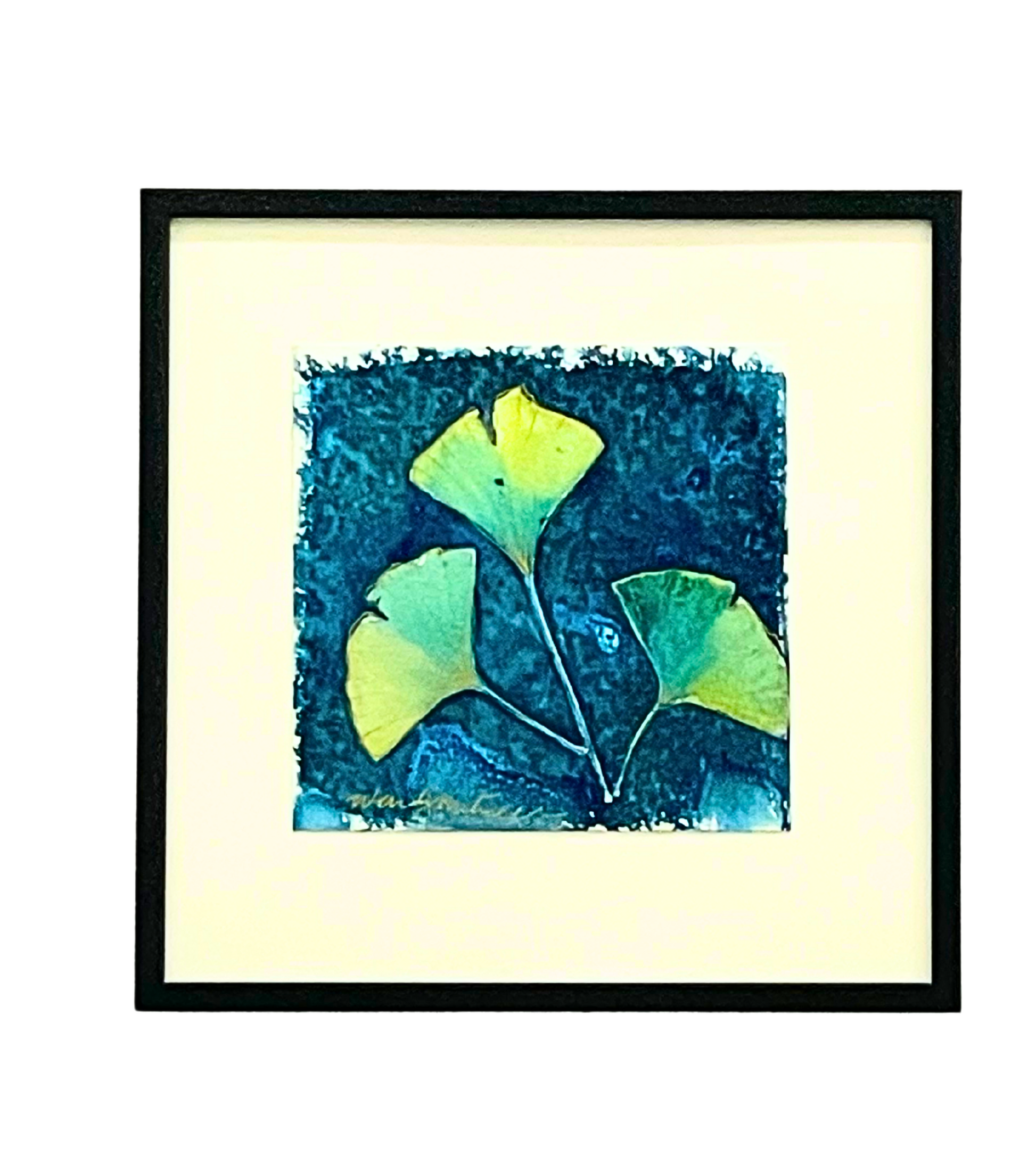 Original Ginkgo leaf cyanotype on 140 lb cold pressed watercolor paper. Texturized with unique additives to pull out a distinctive exposure of the leaf, and embellished with custom mixed watercolor and gold archival ink.
