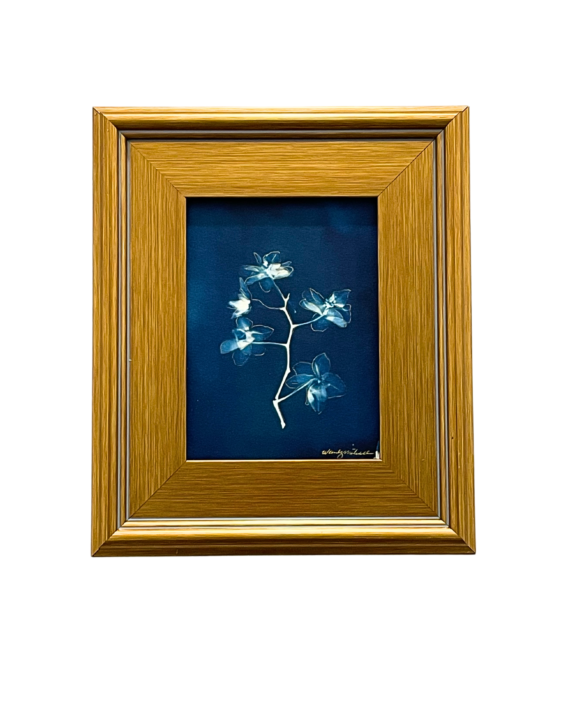 An orchid stem, delicate yet enduring, emerges in shades of indigo and white. Accented with fine touches of gold pen, this cyanotype captures the orchid’s timeless symbolism of elegance and strength. Minimal and refined, this piece celebrates the quiet beauty found in nature’s most intricate forms.