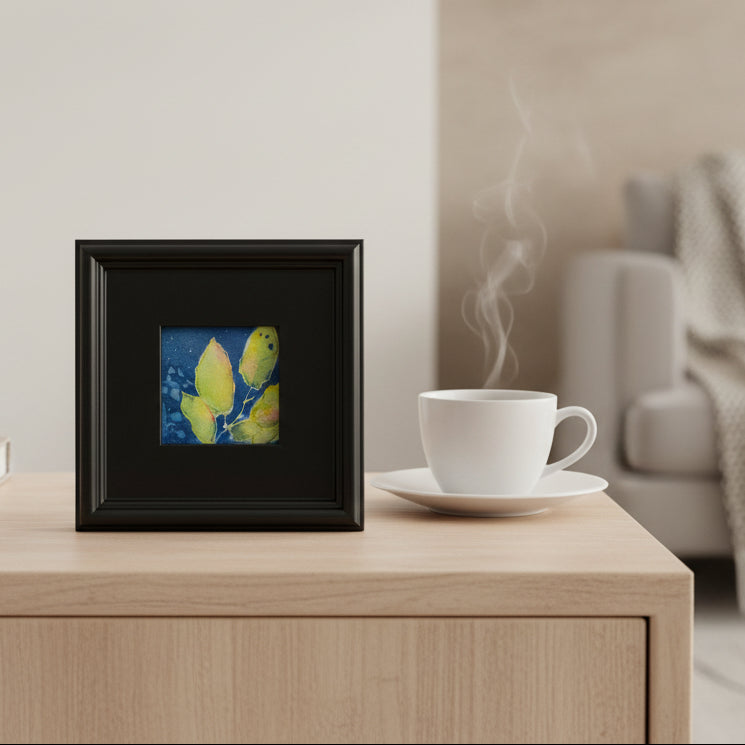 Soft leaves drift across a field of luminous blue, layered with watercolor and touches of gold. This piece captures that quiet moment when light lingers just a little longer — suspended, gentle, and full of breath.