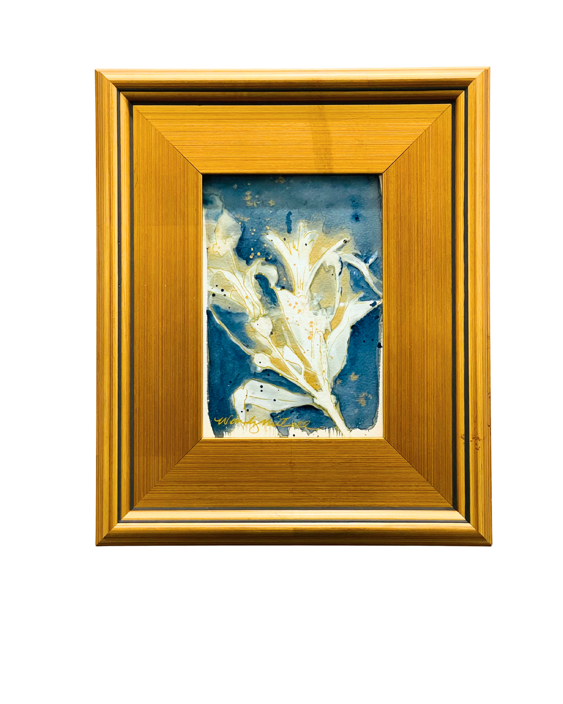 A bold bloom Lily Cyanotype and gold watercolor, cast in high contrast—flame-like in its purity, calm in its presence. White Fire brings together light and shadow in perfect balance, capturing a moment of botanical stillness that glows from within.